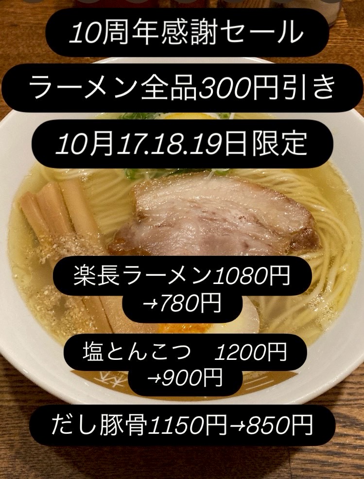 【10周年感謝10月17.18.19日ラーメン全品300円引き】